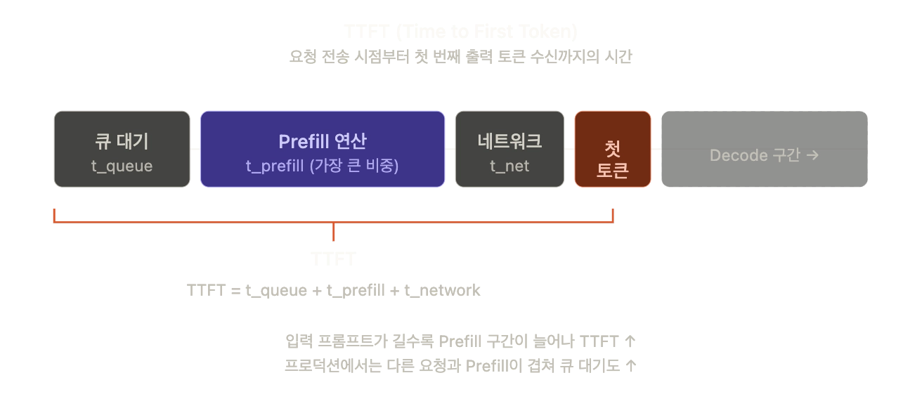 사용자가 요청을 보낸 순간부터 첫 번째 출력 토큰을 받기까지의 시간입니다. 체감 반응 속도 그 자체라서 챗봇이나 실시간 서비스에서 가장 먼저 보는 지표입니다.