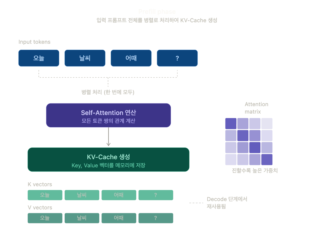 Prefill은 사용자가 입력한 프롬프트를 한꺼번에 병렬로 처리하는 단계입니다. "오늘 날씨 어때?"라는 4개의 토큰이 들어오면, 이 토큰들을 순차적으로 하나씩 보는 게 아니라 동시에 Self-Attention 연산을 수행합니다.