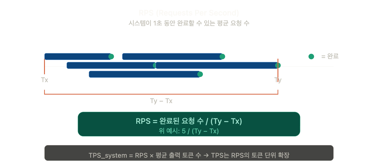 TPS가 토큰 단위 처리량이라면, RPS는 요청 단위 처리량입니다. 둘의 관계는 다음과 같습니다: