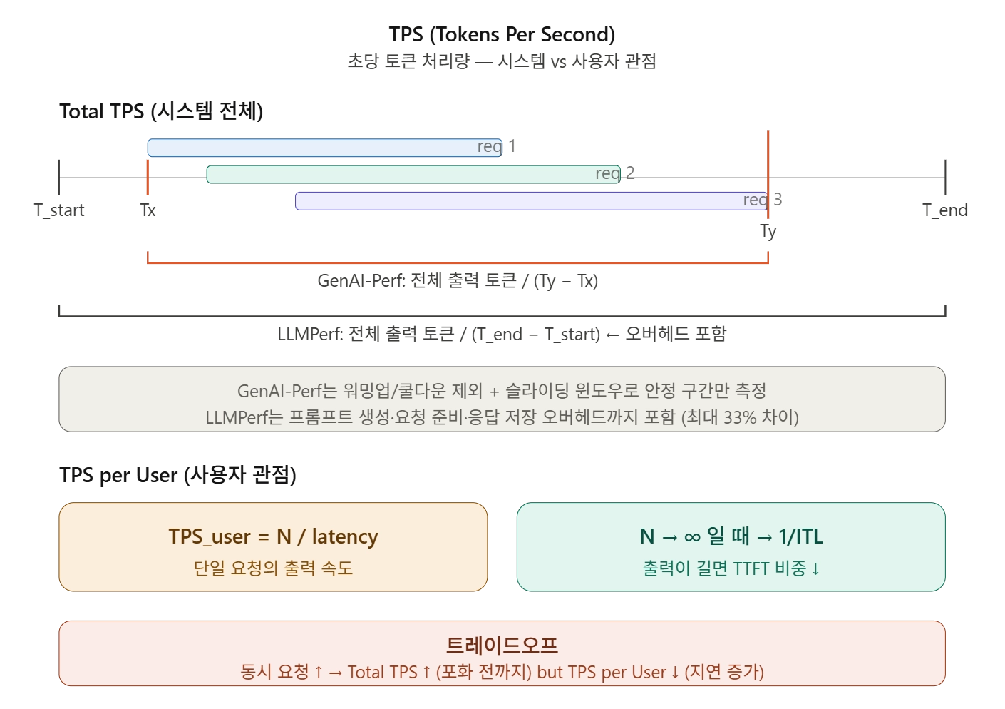 동시에 처리되는 모든 요청의 출력 토큰 총합을 시간으로 나눈 값입니다. 동시 요청(concurrency)이 늘면 Total TPS도 증가하지만, GPU 자원이 포화되면 감소로 전환됩니다.