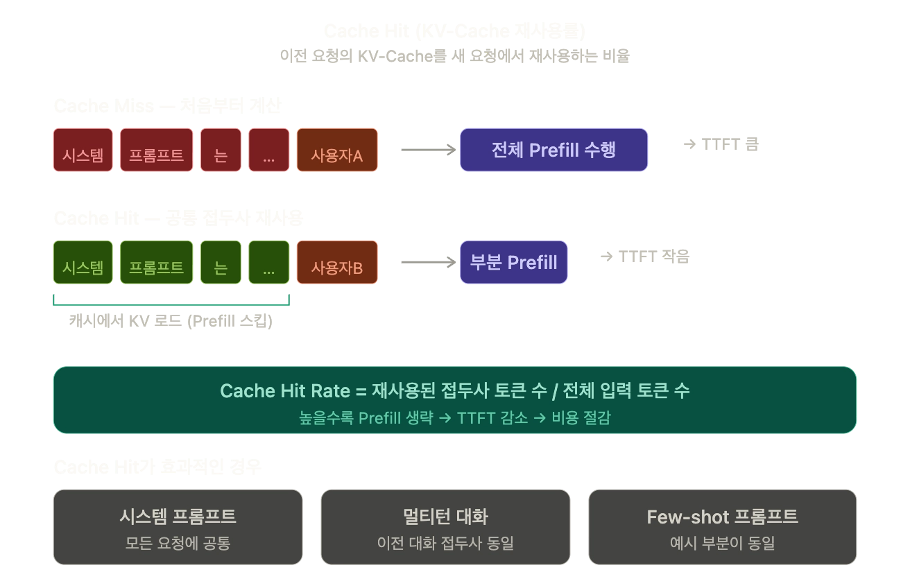 | Cache Hit | Prefill 최적화 | KV-Cache 재사용으로 Prefill을 얼마나 줄였는가? |