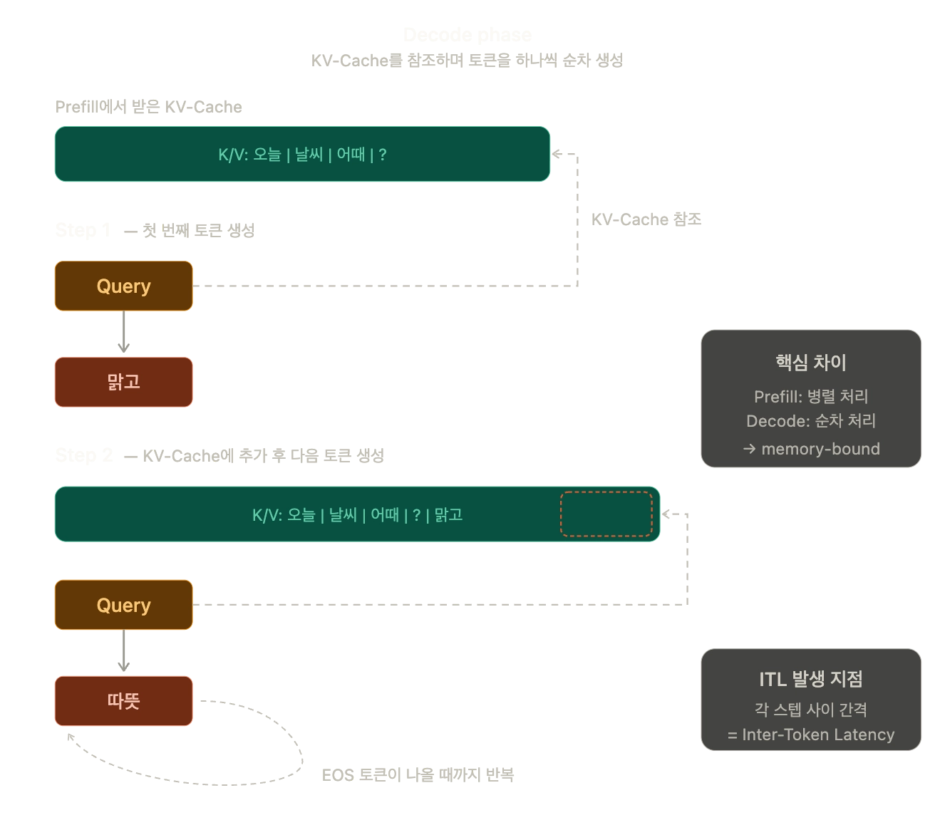 Prefill과의 결정적인 차이는 병목 지점입니다. Prefill 은 한꺼번에 대량 연산을 돌리니까 compute-bound이지만, Decode는 매 스텝마다 토큰 1개만 처리하면서 점점 커지는 KV-Cache를 GPU 메모리에서 읽어와야 하므로 memory-bandwidth-bound 입니다.