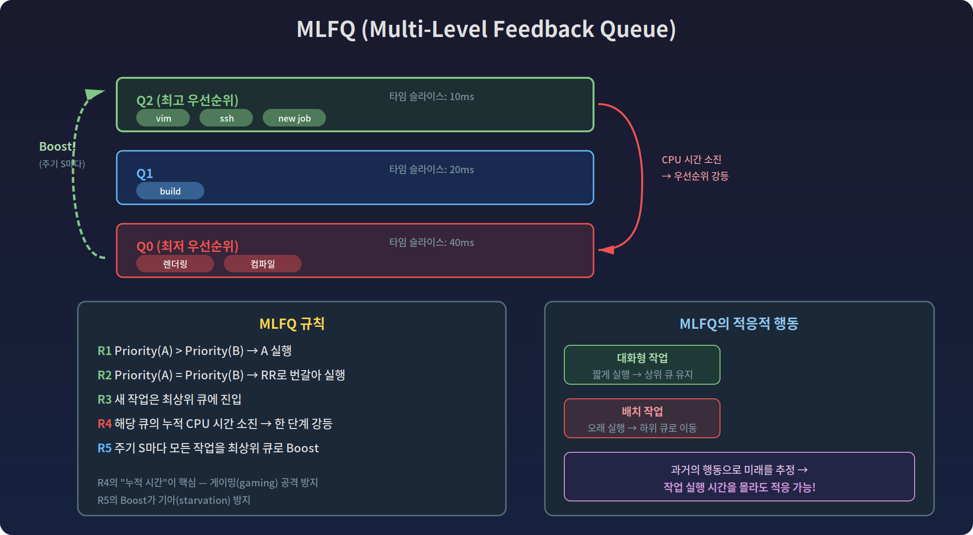 다이어그램은 MLFQ의 3단계 큐 구조와 규칙을 보여준다. 대화형 프로세스(vim, ssh)는 짧게 실행되므로 상위 큐에 머무르며 빠른 응답을 받고, 배치 작업(렌더링, 컴파일)은 CPU를 오래 사용하므로 하위 큐로 강등된다. 왼쪽의 Boost 화살표는 주기적으로 모든 작업을 최상위로 끌어올려 기아를 방지하는 메커니즘이다.