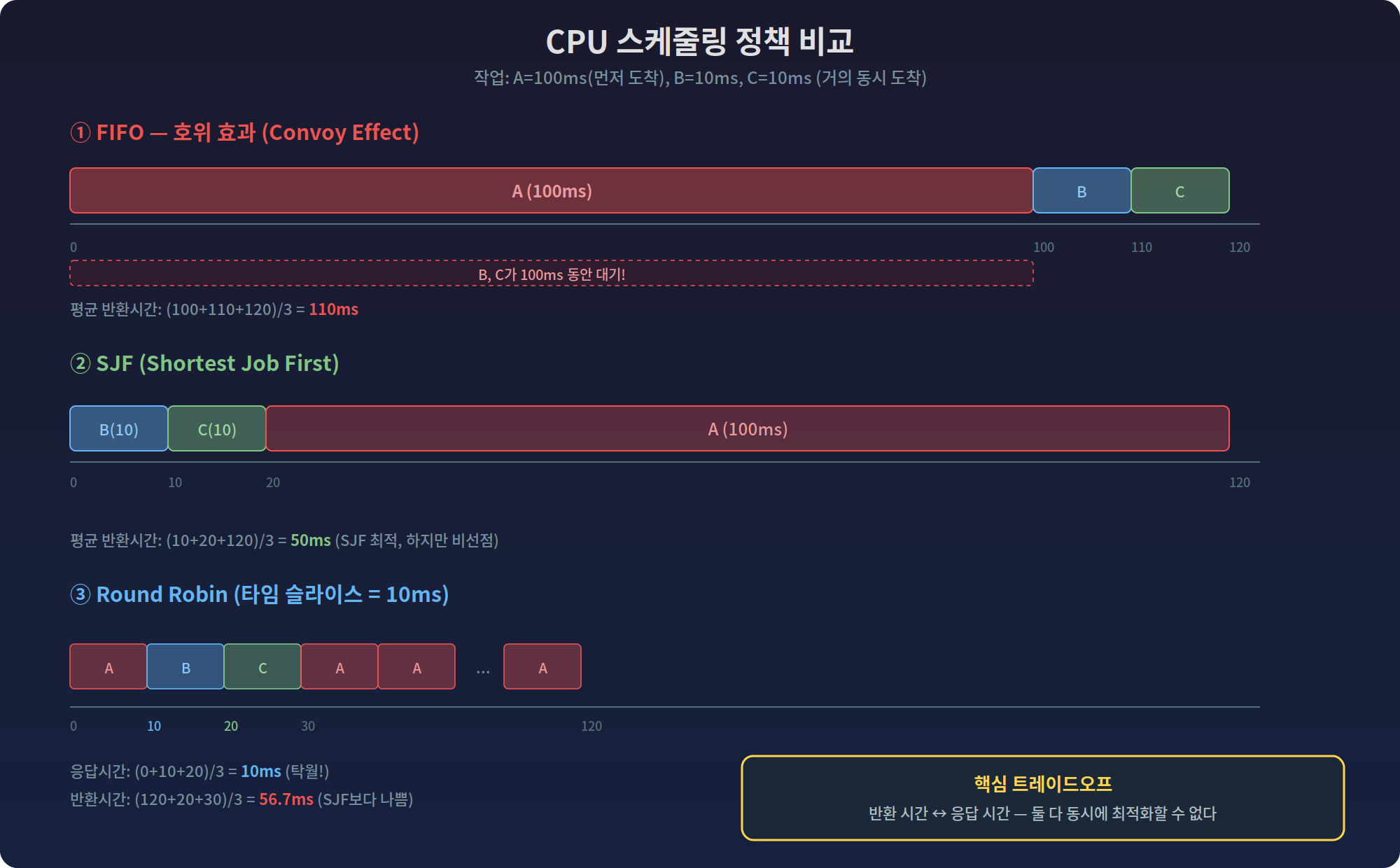 이를 가능하게 하는 두 축은 메커니즘과 정책이다. 메커니즘(문맥 교환, 이중 모드, 트랩)은 "어떻게" 프로세스를 전환할 것인가를, 정책(FIFO, SJF, RR, MLFQ, CFS)은 "어떤" 프로세스에게 CPU를 줄 것인가를 결정한다.