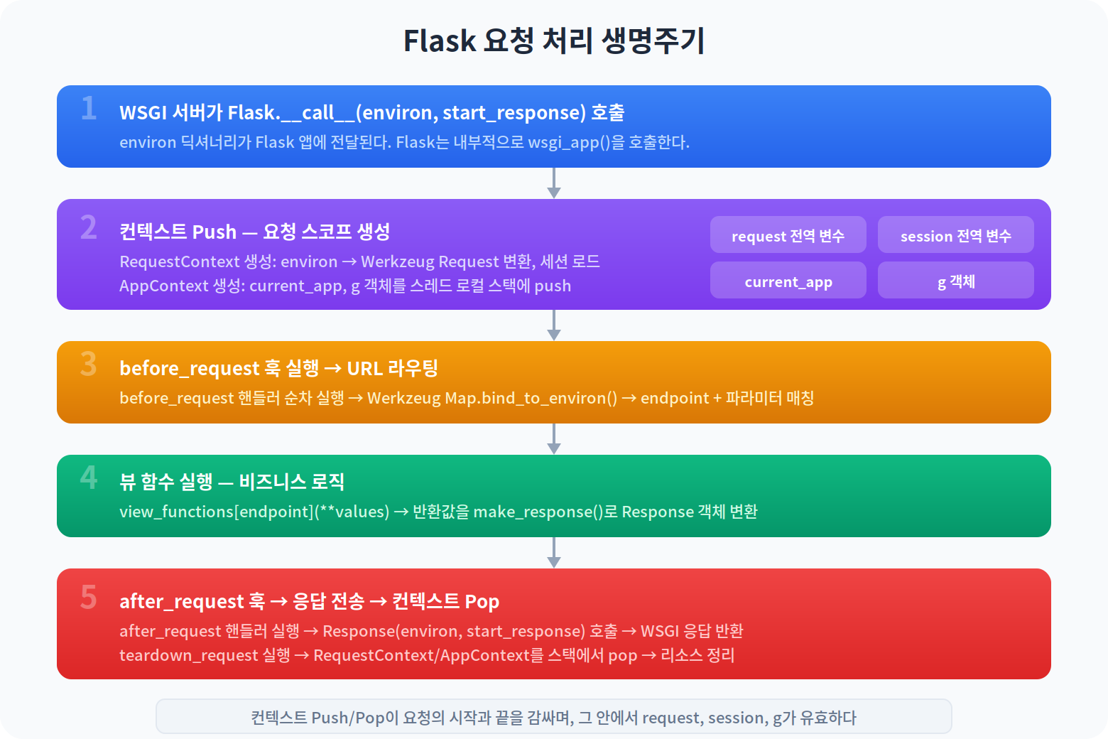 after_request는 정상 응답 시에만 실행되며, Response 객체를 받아 수정할 수 있다. teardown_request는 예외 발생 여부와 관계없이 항상 실행되며, 리소스 정리에 사용한다. teardown_request 이후 컨텍스트가 pop되면서 g, request, session이 모두 무효화된다.