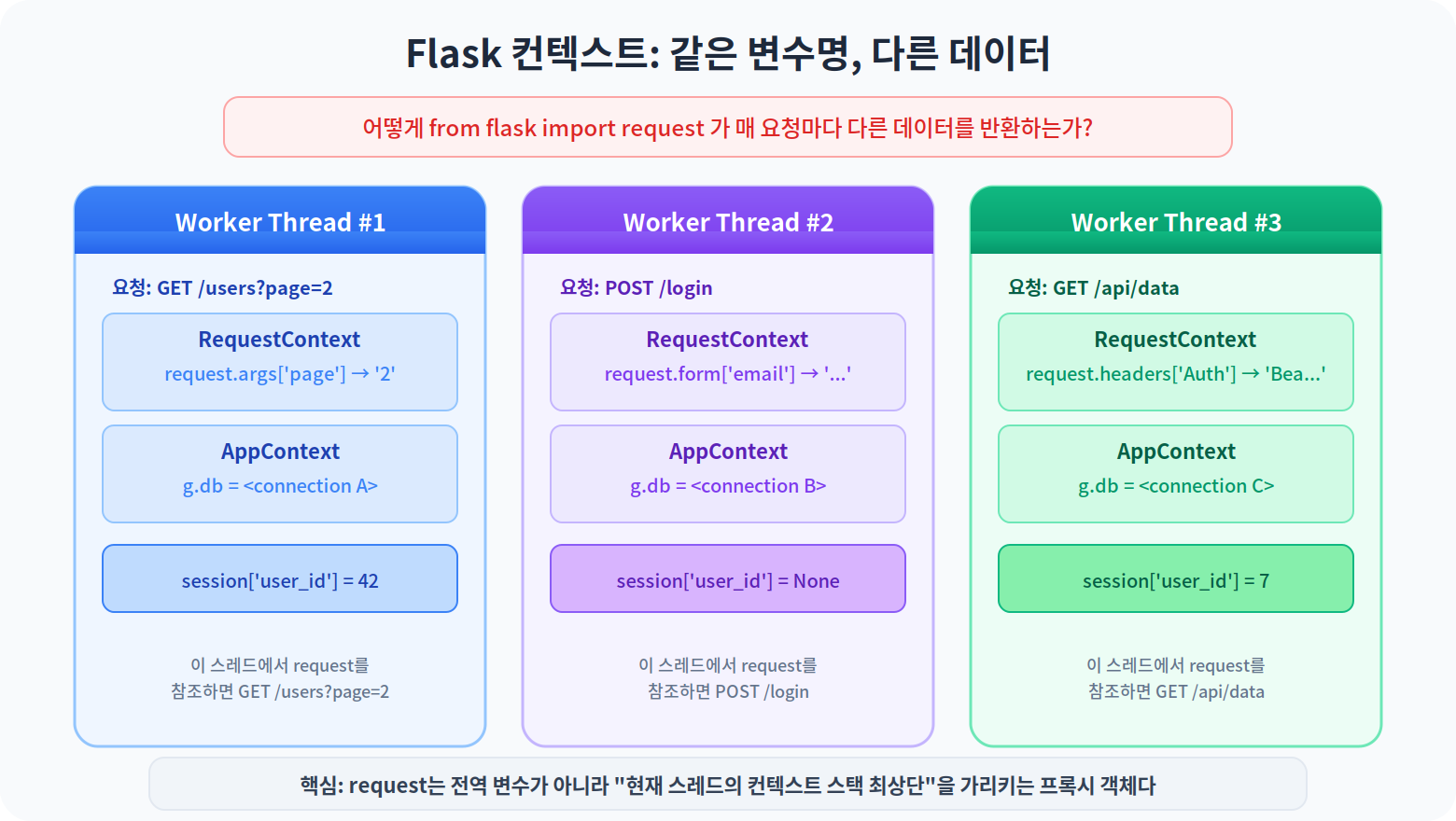 Flask의 컨텍스트 시스템은 프레임워크의 가장 핵심적인 — 그리고 가장 오해받기 쉬운 — 부분이다. from flask import request로 임포트한 request가 어떻게 매 요청마다 다른 데이터를 반환하는지, 그 메커니즘을 정확히 이해해보자.