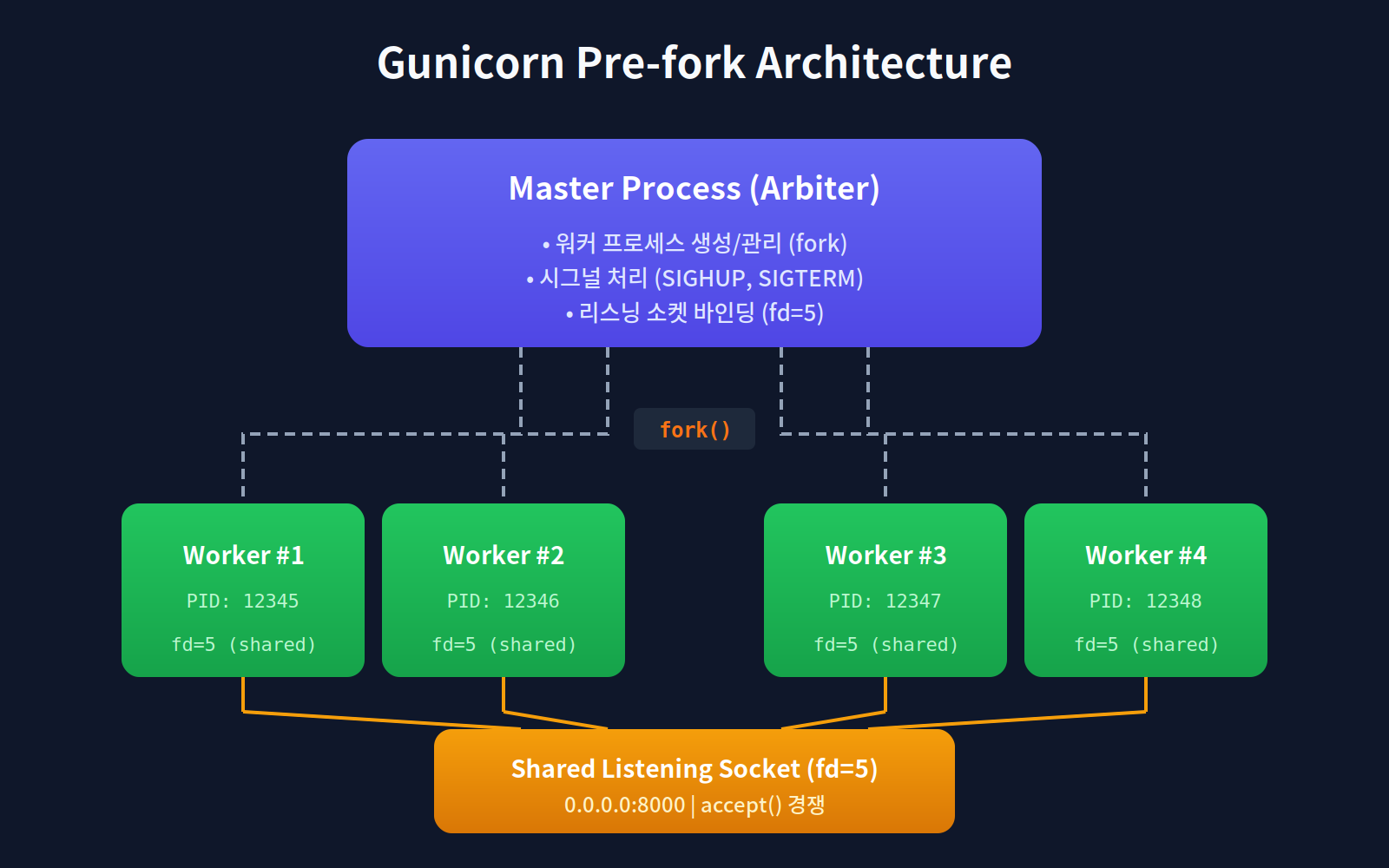 핵심 포인트: fork() 이후 자식 프로세스는 부모의 파일 디스크립터를 그대로 상속받는다. 4개의 워커 프로세스가 모두 **같은 리스닝 소켓(fd=5)**을 공유하게 된다.