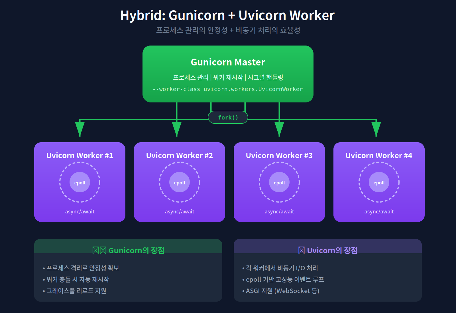 Gunicorn이 프로세스 관리의 안정성을 제공하고, Uvicorn이 각 프로세스 내에서 비동기 처리의 효율성을 제공한다. 하나의 Uvicorn 워커가 죽어도 Gunicorn 마스터가 새 워커를 spawn한다.