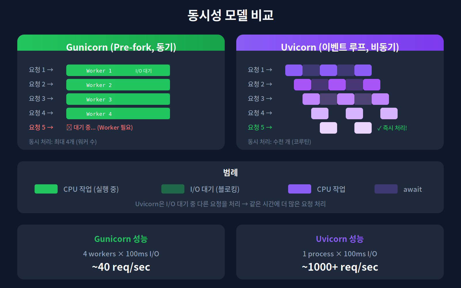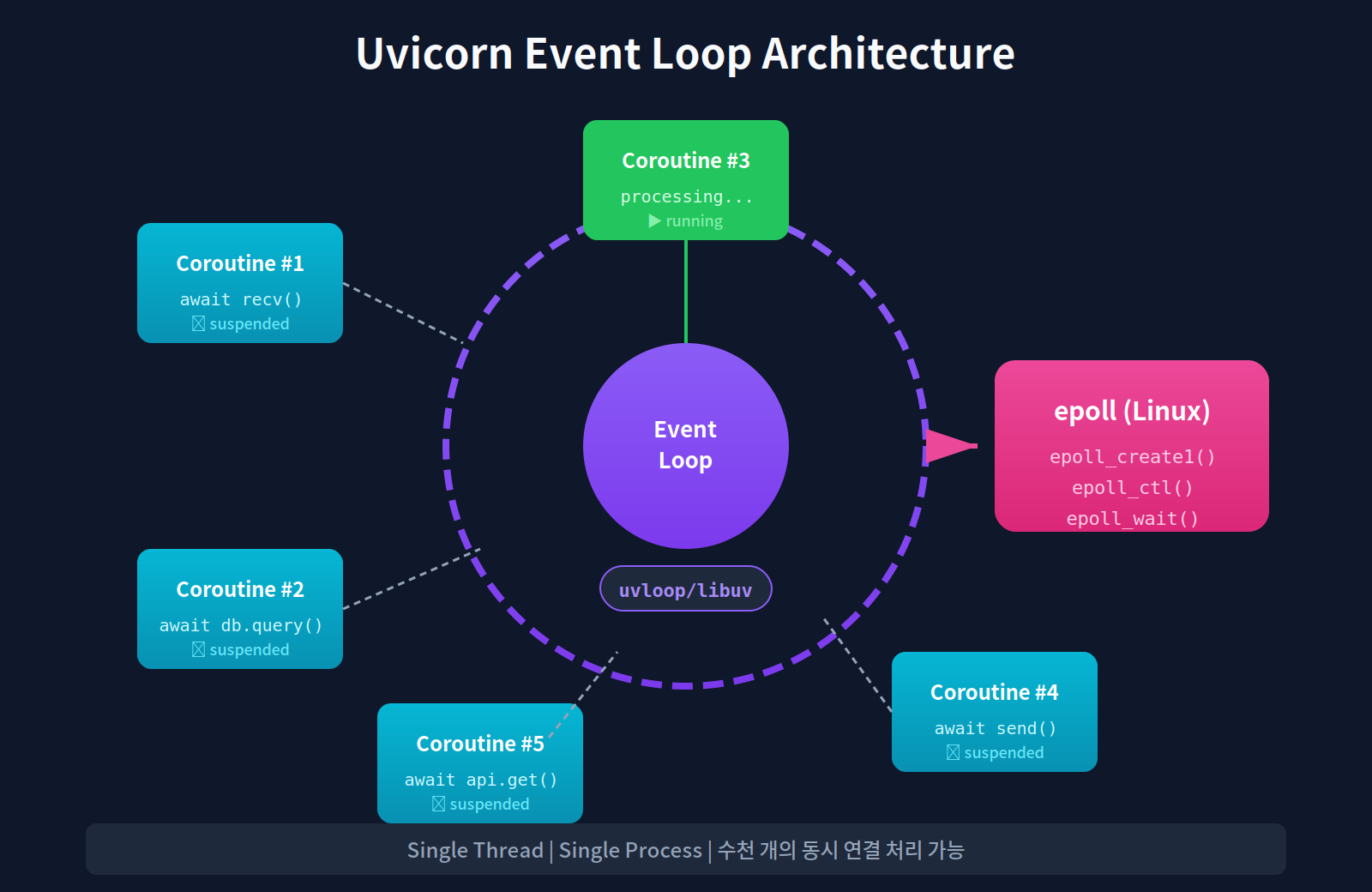 Uvicorn (이벤트 루프, 비동기)에서는 하나의 프로세스가 수천 개의 동시 연결을 처리할 수 있다. I/O 대기 시간을 다른 코루틴 처리에 활용하기 때문이다.