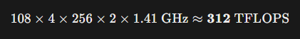 위 계산은 FP16(반정밀도) Tensor Core를 사용했을 때의 기준이다. 만약 FP32로 연산한다면 A100의 성능은 19.5 TFLOPS로 급락한다.